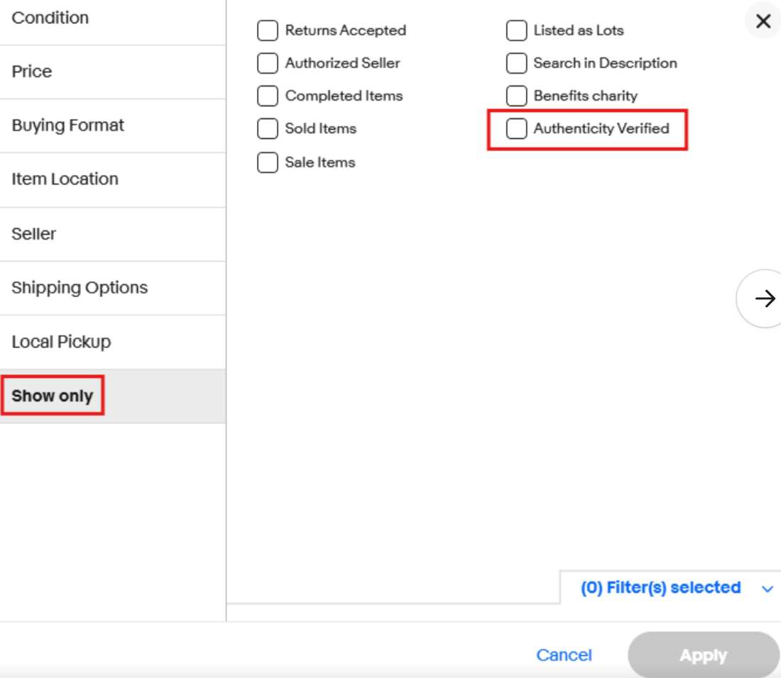 3. 左側のフィルターの「Show only」で「Authenticity Verified」を選択し、「Apply」をクリックします。