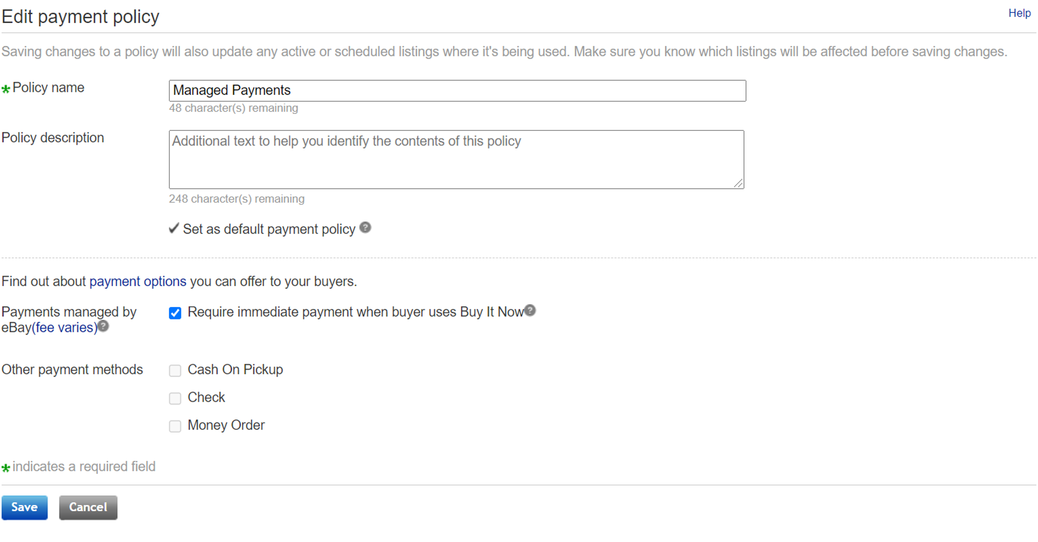 即決価格購入時に支払いも同時にしてもらう場合は、Require immediate payment when buyer users Buy It Nowにチェックを入れておきます。