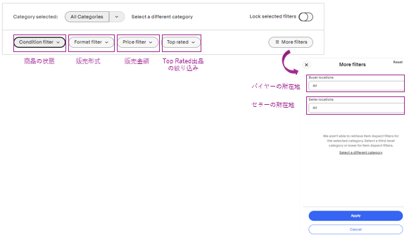 Search productsに調査したい商品の名前を英語で検索します。検索結果が表示されてから、詳細の条件を設定します。日本からの販売実績を確認したい場合は、[More filters]>[Seller locations – All]をJapanに設定し、[Apply]をクリックしてください。