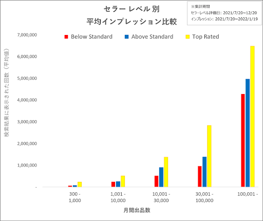 Top Ratedの優遇措置で、検索順位が優遇されます。各セラーレベル別のインプレッション(検索結果に表示された回数)を比較した以下のグラフから、その差がご確認頂けます。