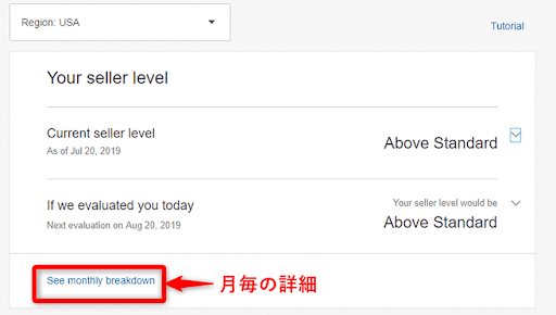 セラーレベルのページ内にSee monthly breakdownをクリックします。