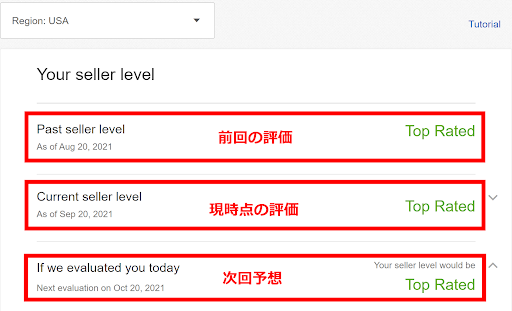 セラーレベルの画面では、前回の評価(Past seller level)・現時点の評価(Current seller level)・次回予想(If we evaluated you today)が表示されます。
