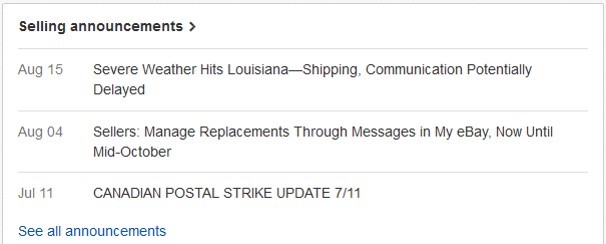 Selling announcementsは、eBayからの最新のアナウンス内容をご確認いただく場所です。eBay出品のルール改正時にはその情報も掲載されるので常に確認するよう心掛けましょう。