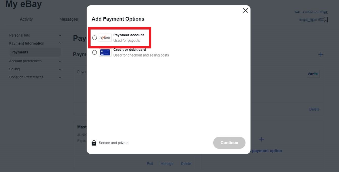 - [My eBay] → [Account]タブ → [Payments]の順に進みます。