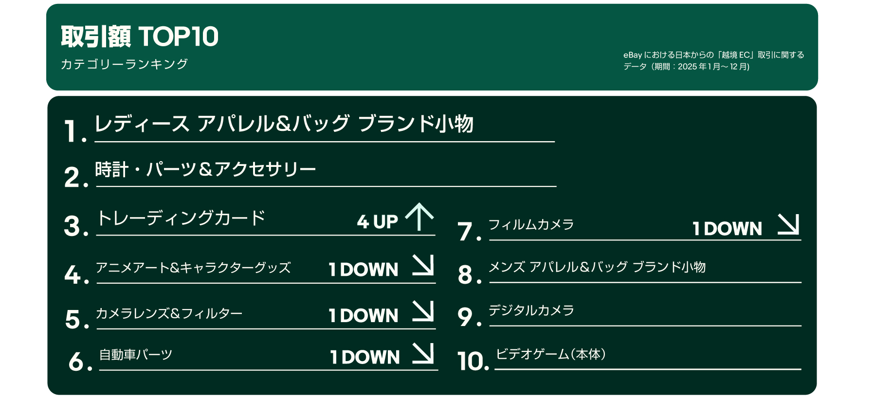 世界最大規模のオンライン・マーケットプレイス「eBay(イーベイ)」への出店を通じ、17年以上日本セラーの越境EC(海外販売)を支援するイーベイ・ジャパン株式会社(所在地:東京都渋谷区、代表取締役社長:岡田 雅之、以下イーベイ・ジャパン)は、2025年の総括と2026年の販売動向に関する越境ECレポートを発表しました。