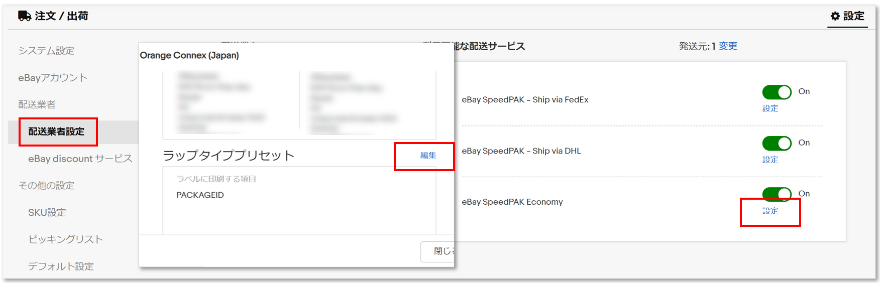 設定画面で「配送業者設定」>eBay SpeedPAK Economyの「設定」>ラップタイププリセットの「編集」を選択します。